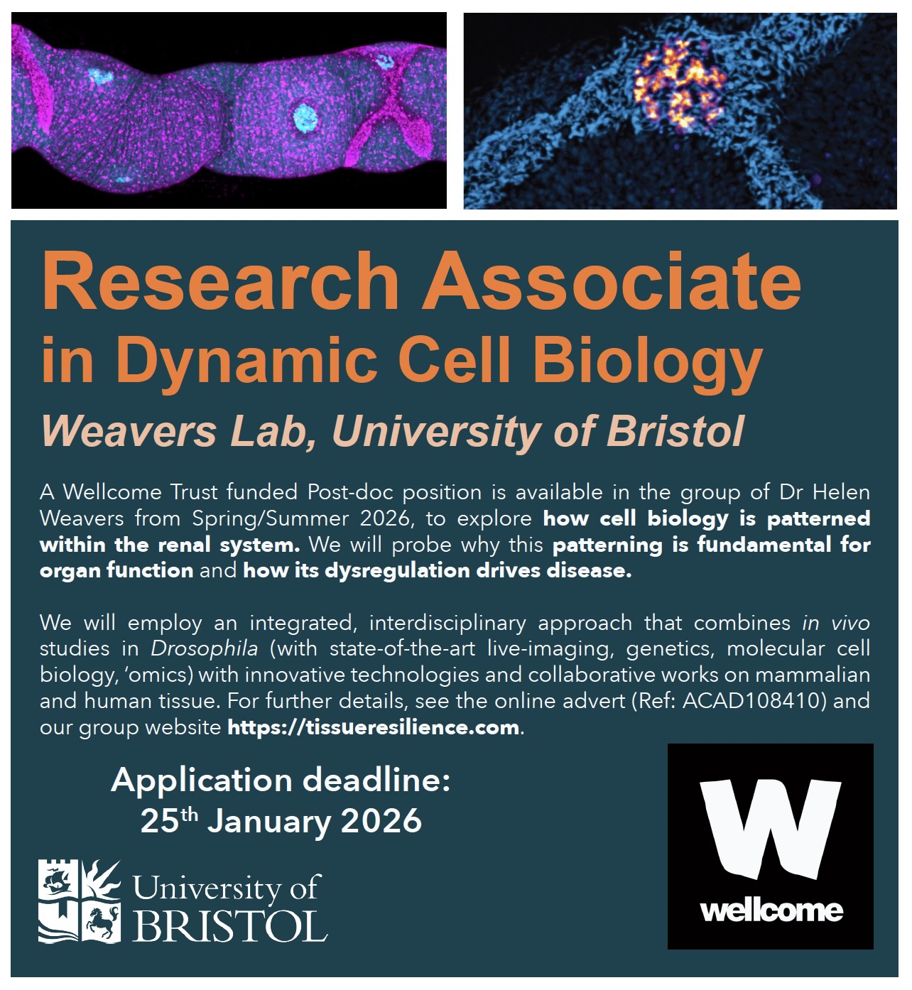 The project will investigate how dynamic cell biology supports tissue function and host health. Specifically, we will probe how cell biology is patterned within the renal system, and why disruption of this cellular coordination could be a key driver of disease. For further details, see the online advert (Ref: ACAD108410; https://www.jobs.ac.uk/job/DPW711/research-associate-in-dynamic-cell-biology). The application deadline is 25th January 2026.